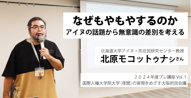 国際人権大学院大学(夜間)の実現をめざす大阪府民会議では毎年様々な切り口で人権をテーマにした「プレ講座」を開講している。2024年度の第1回講座は北海道大学・先住民族研究センターの北原モコットゥナㇱ教授に「なぜもやもやするのか アイヌの話題から無意識の差別を考える」をテーマに講演していただいた。その様子を報告する。